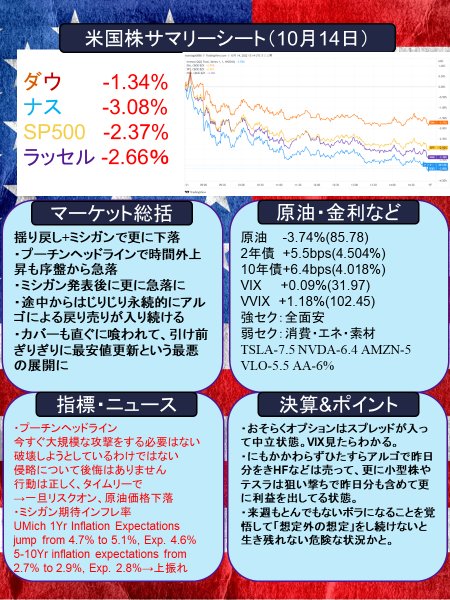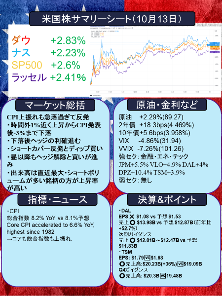 では「【米国株】インフレ指標で上下・短期資金の遊び場(週間振り返り10月10日-14日)」をまとめていきますね!*投資判断はあくまで自己責任で